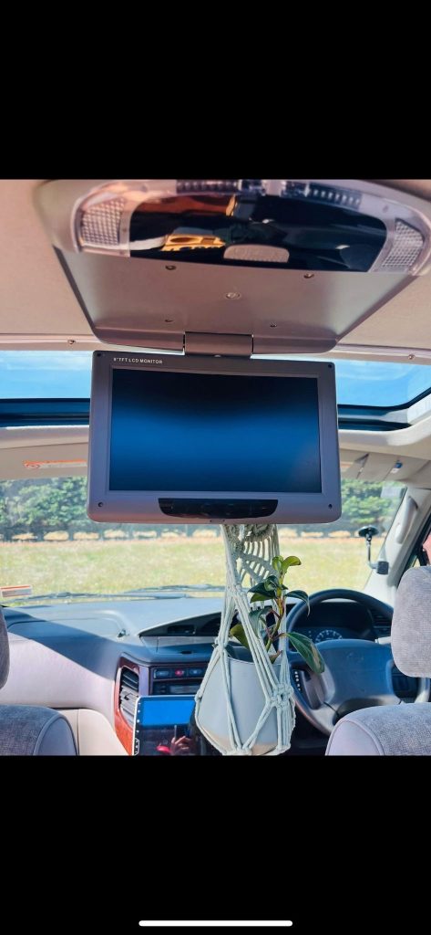 - 📺 Entertainment system in the back with a fold Up TV screen, headphone ports on either side of the bed and 4x USB/SC card ports (bring your favourite movies on a stick and watch them in the van)