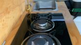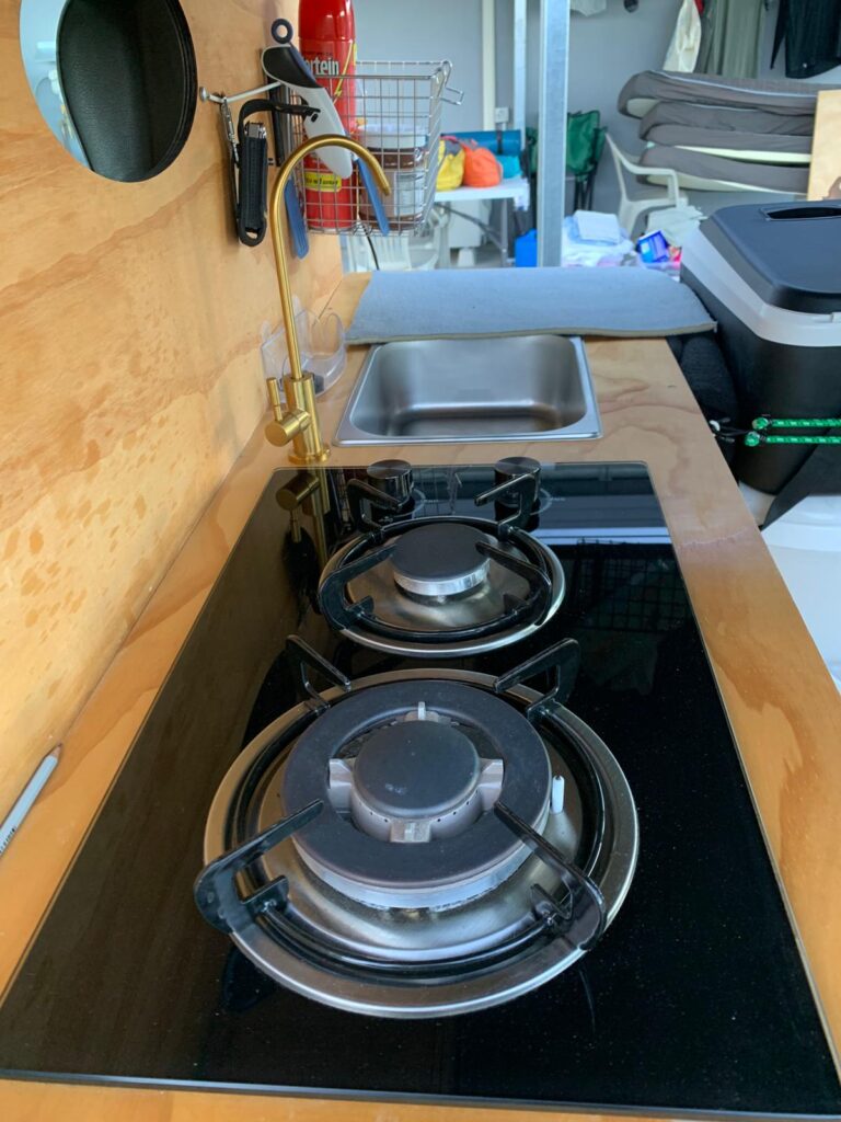 • Kitchen: Gas hob, worktop, storage space for dishes, sink with 45L fresh water tank, recently installed refrigerator.