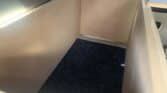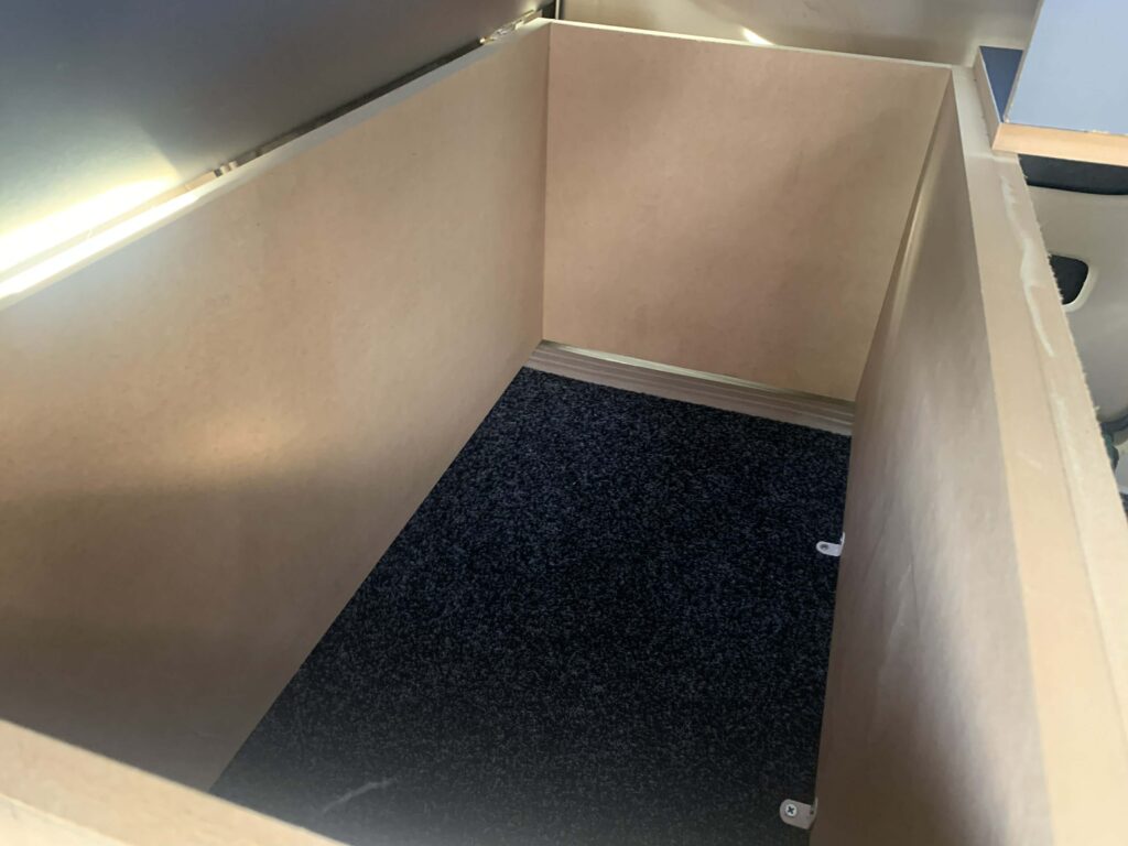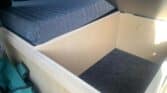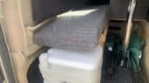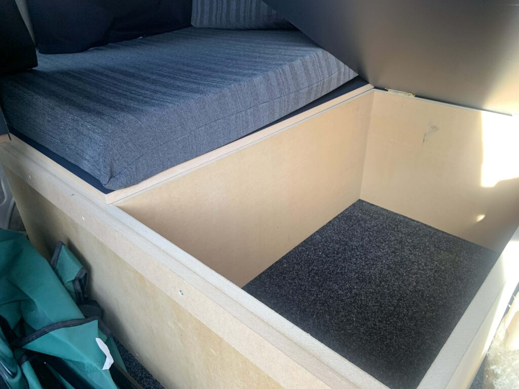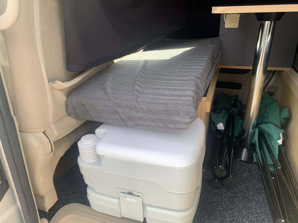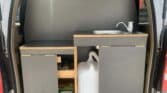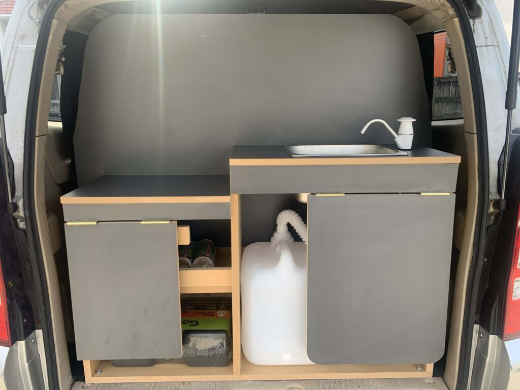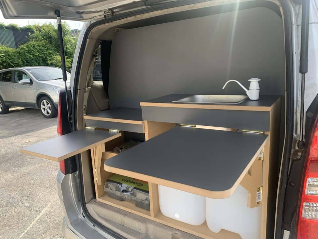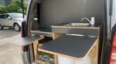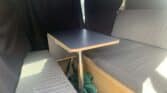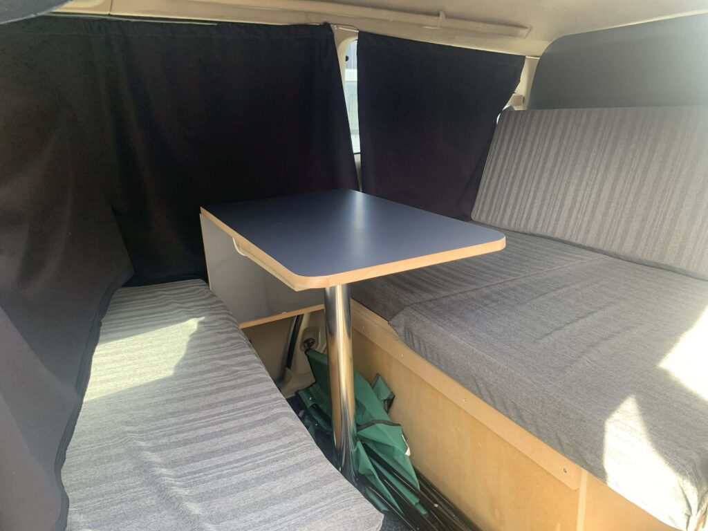 *Brand-new interior with table set up, double big mattress, kitchen at the back, and some camping gear.