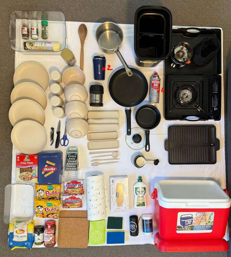 • 2 camping stoves + grill pan + 4 gas canisters